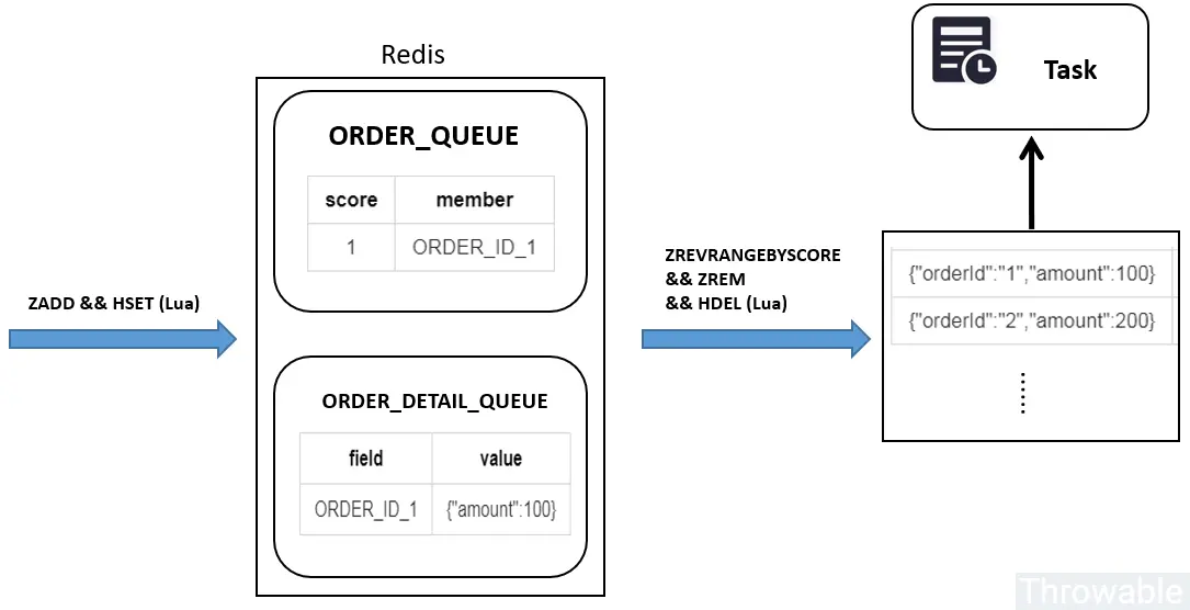 这里其实有一个性能隐患,命令ZREVRANGEBYSCORE的时间复杂度可以视为为O(N),N是集合的元素个数,由于这里把所有的订单信息都放进了同一个Sorted Set(ORDER_QUEUE)中,所以在一直有新增数据的时候,dequeue脚本的时间复杂度一直比较高,后续订单量升高之后会此处一定会成为性能瓶颈,后面会给出解决的方案。