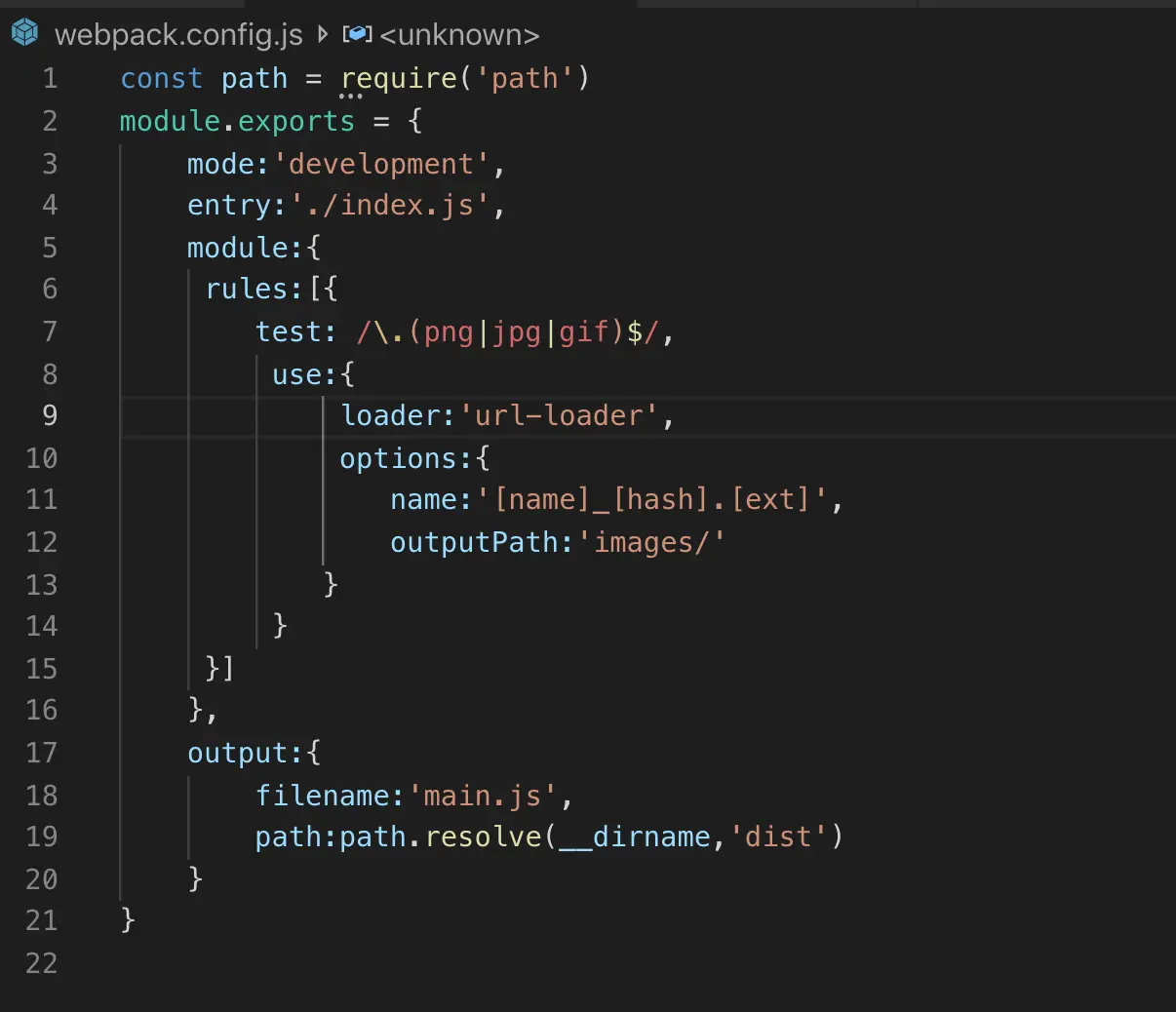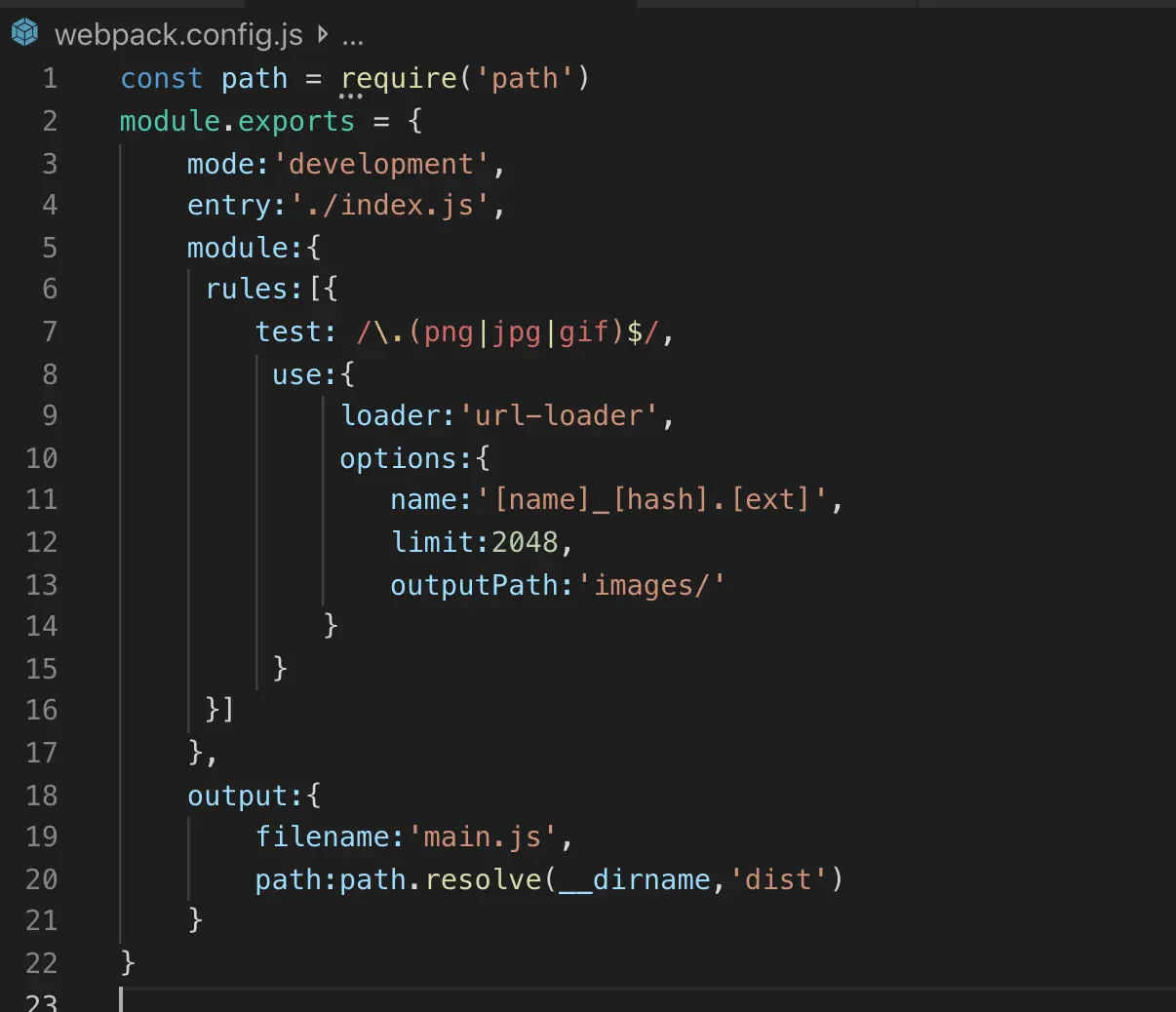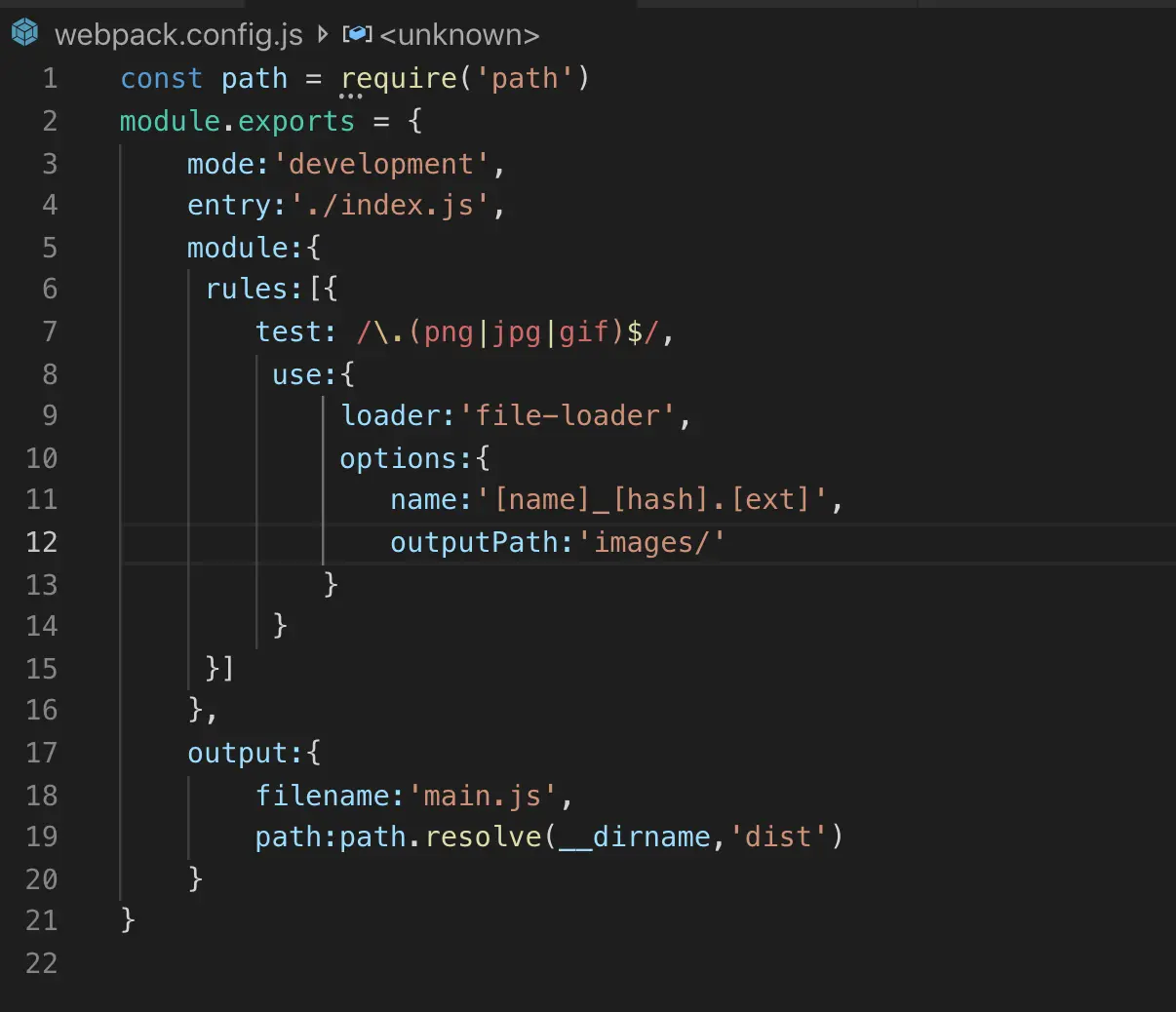name:'[name].[ext]' // 保持原有的名称,.[ext]占位符。[hash]占位符,hash字符串,也就是这个图片的字符串。