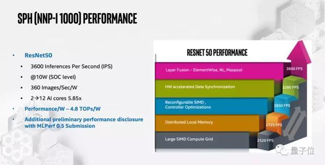 在ResNet50上,NNP-I在10W的功率水平上每秒可以完成3600次推理,每瓦每秒可以处理360张图片。