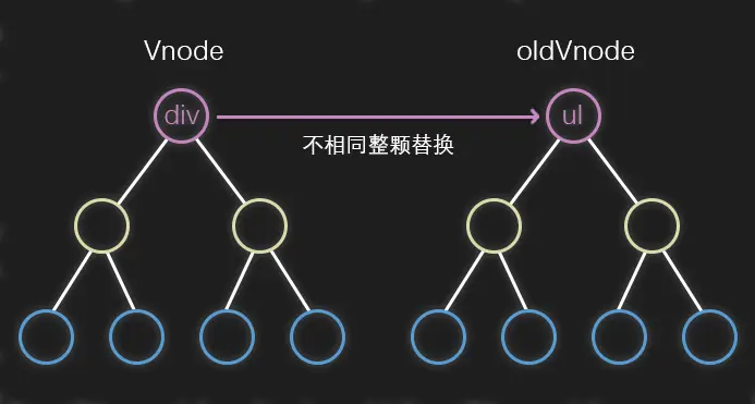 VNode和oldVNode不是同一个节点时,直接会将VNode创建为真实Dom,插入到旧节点的后面,这个时候旧节点就变成了废弃节点,移除以完成替换过程。