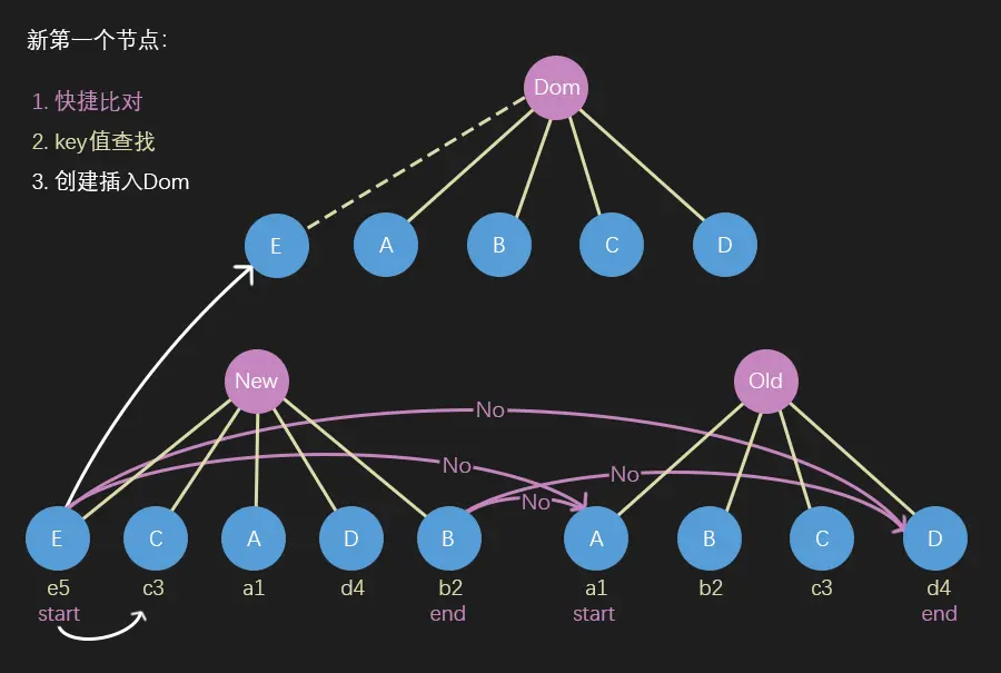 key值列表查找,并没有找到说明E是新增的节点,创建对应的真实Dom,插入到旧节点里start对应真实Dom的前面,也就是A的前面,已经处理完了一个,新start位置后移一位。