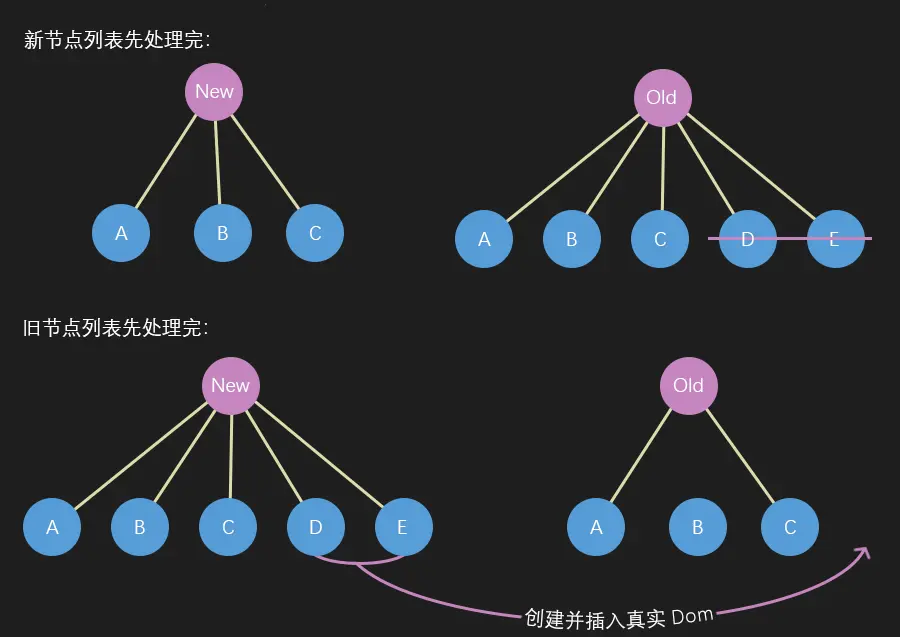 我们之前的示例刚好是新旧节点列表同时处理完退出的循环,这里是退出循环后为还有没有处理完的节点,做不同的处理: