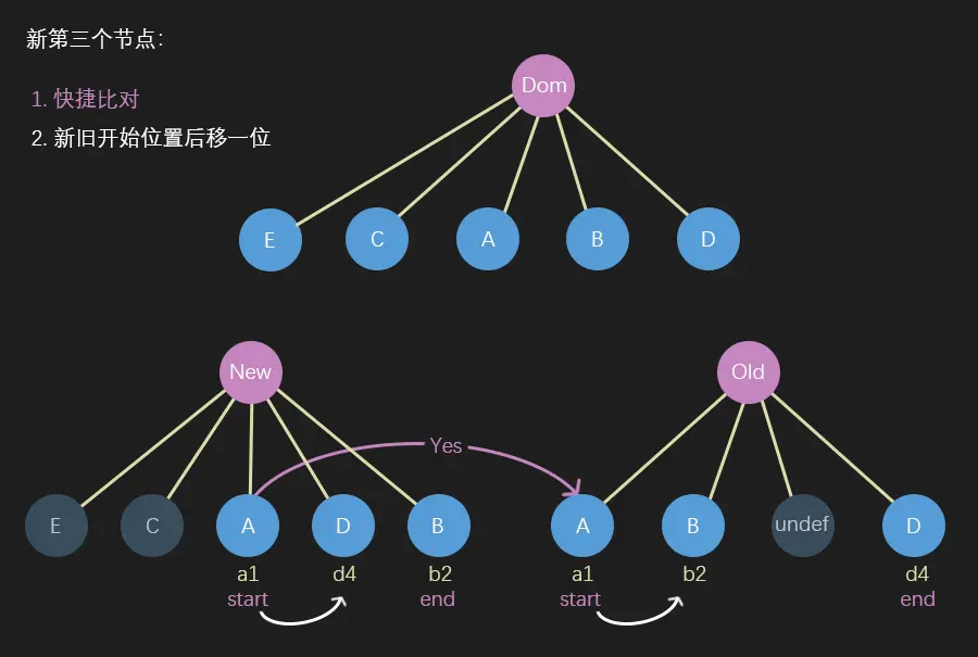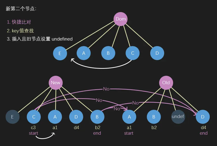 key值列表查找。发现是已有的节点,只是位置不对,那么进行插入操作,参考节点还是A节点,将原来旧节点C设置为undefined,这里之后会跳过它。又处理完了一个节点,新start后移一位。