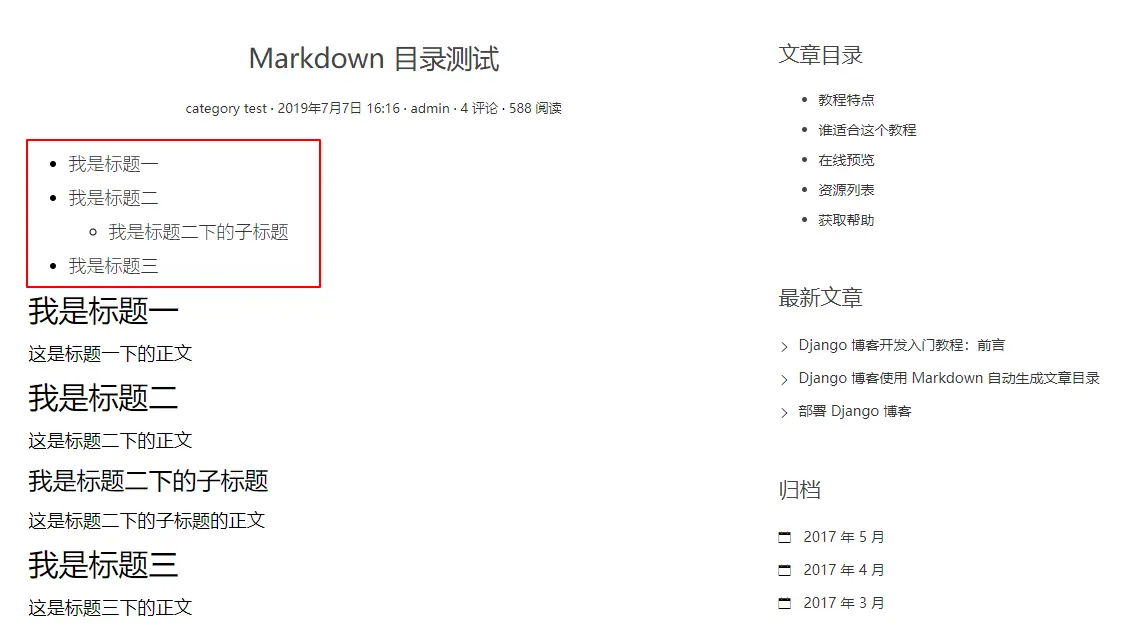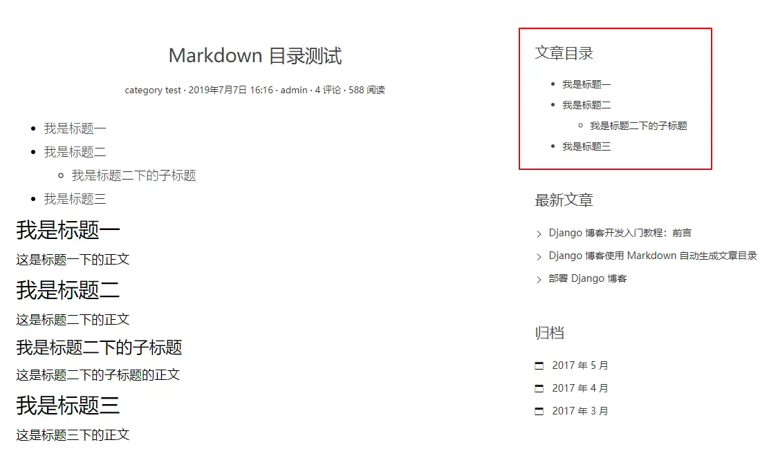 和之前不同的是,extensions 中的 toc 拓展不再是字符串 markdown.extensions.toc ,而是 TocExtension 的实例。TocExtension 在实例化时其 slugify 参数可以接受一个函数,这个函数将被用于处理标题的锚点值。Markdown 内置的处理方法不能处理中文标题,所以我们使用了 django.utils.text 中的 slugify 方法,该方法可以很好地处理中文。