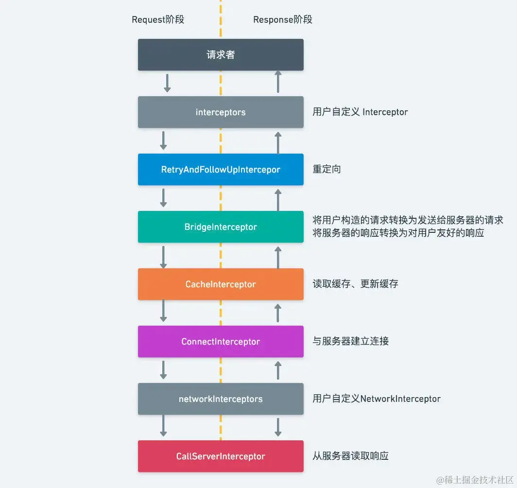 Response proceed(Request request):Response throws IOException;//负责往下执行