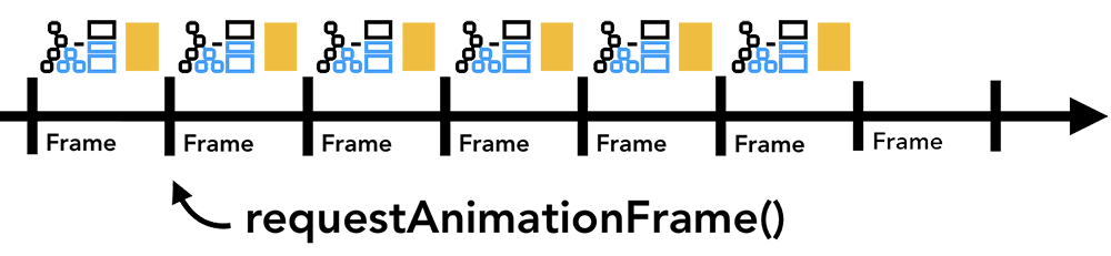 动画:在每个帧之间运行这些操作。大多数显示器每秒刷新屏幕60次(60 fps),当你在每一帧移动屏幕时,动画对人眼来说会很平滑(视觉停留效应)。但是如果动画错过了两者之间的帧或程序运行JS时,则页面将出现卡顿。