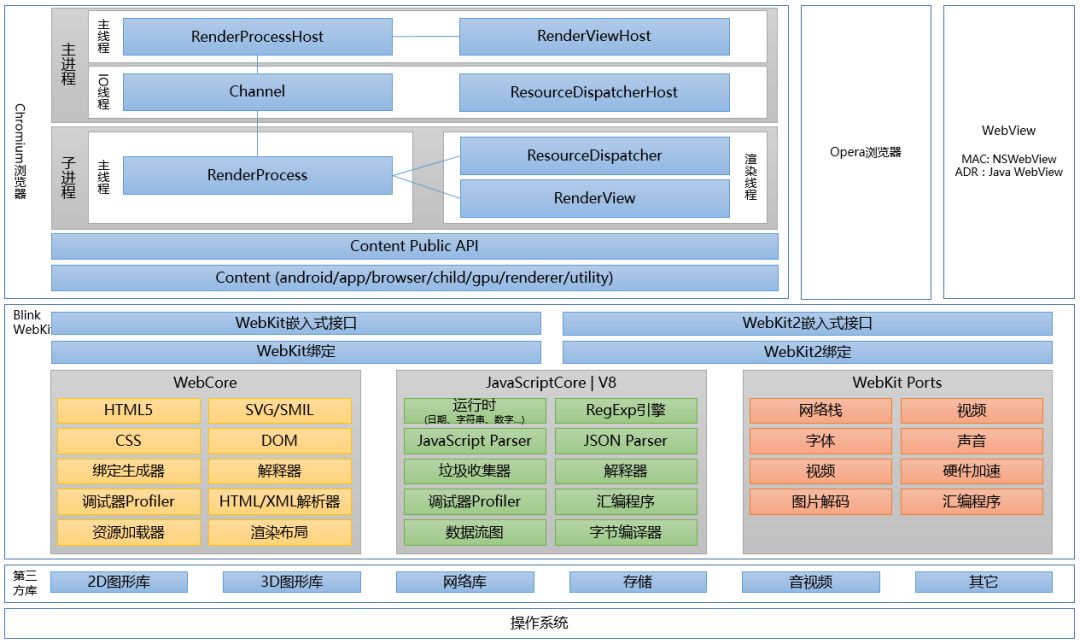第三方库:这些库是WebKit运行的基础,包括2D图形库、3D图形库、网络库、存储库、音视频库等;