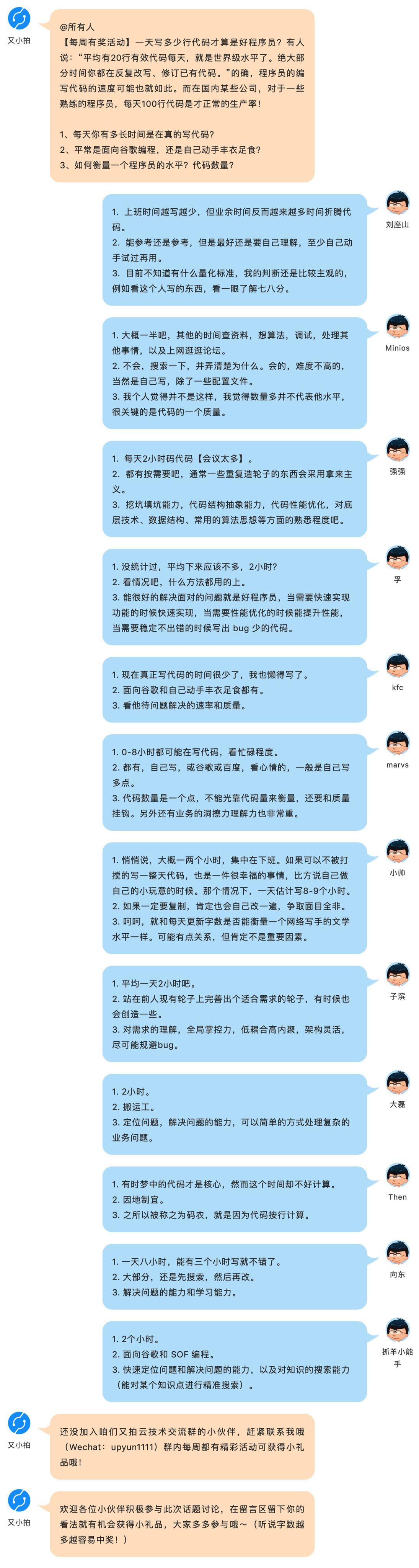 一天写多少行代码才算是好程序员? 又拍云技术团队 2019-08-22 348 阅读1分钟 关注 运维 @又拍云 每周三下午的话题活动是又拍云技术社群的优良传统~ 大家一起来看看这周都聊了些啥吧~ 今天的话题是:一天写多少行代码才算是好程序员呢? 推荐阅读: 【社群话题分享】LAMP 还是 LNMP 或者 ? 【社群话题分享】哪个编辑器你用的最顺手? 【社群话题分享】程序员除了码代码还得会啥? 【社群话题分享】数据权限该怎么放? 【社群话题分享】Linux 各大发行版你怎么选?