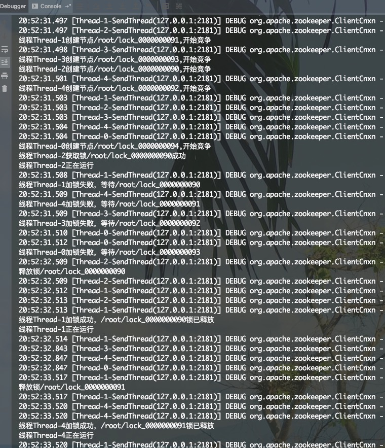 System.out.println("线程" + Thread.currentThread().getName() + "创建节点" + currentLock + ",开始竞争");