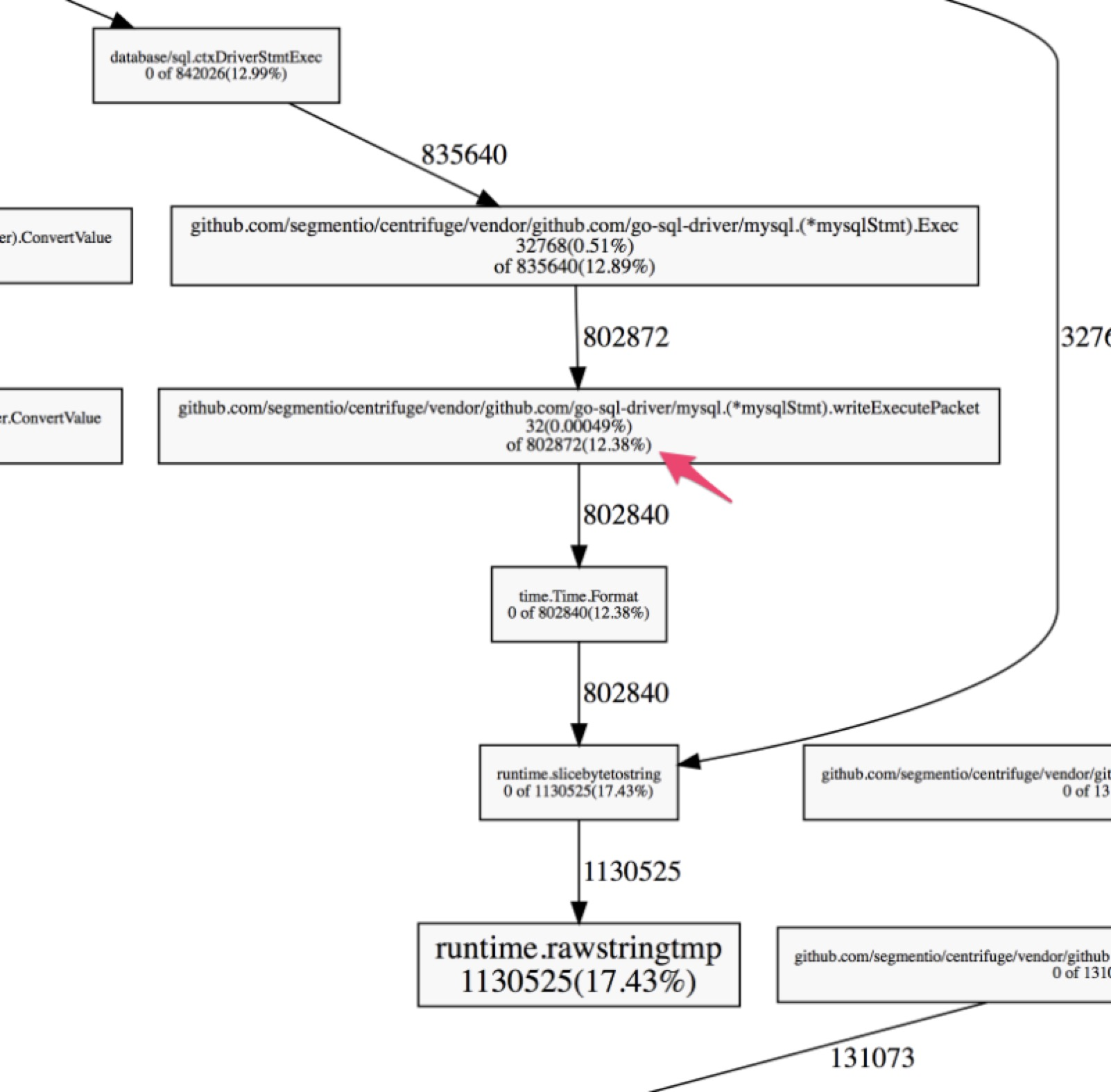Centrifuge集中使用了Mysql。整个程序的效率严重依赖了Mysql driver的效率。在使用pprof去分析了分配行为之后,我们发现Go MySQL driver代码序列化time.Time值的代价十分昂贵。