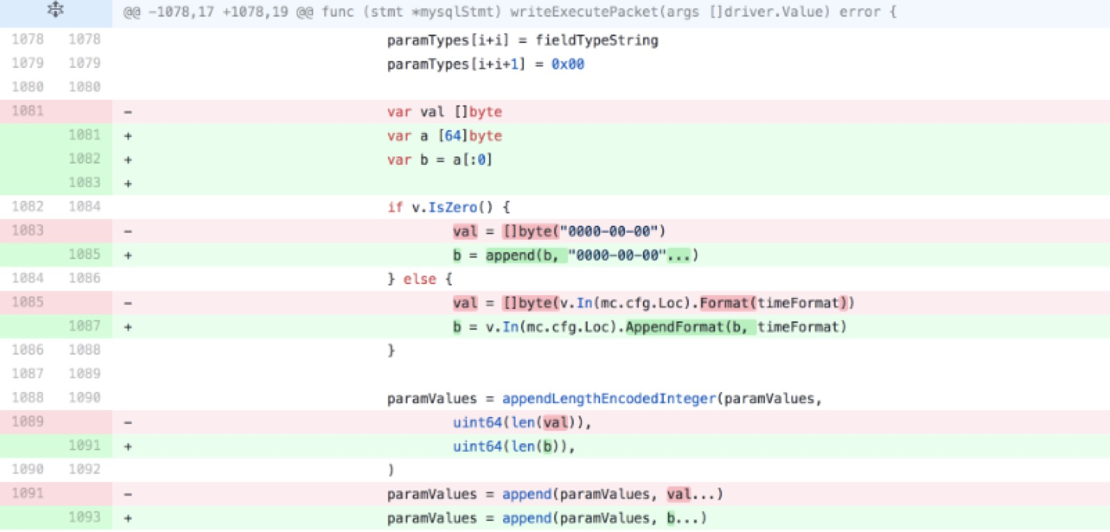 这个小的改动大大减少了这部分代码的堆上分配!类似于我们在MySQL驱动里使用的“附加模式”。在这个PR里,KSUID类型使用了Append()方法。在热路径代码中,KSUID使用Append()模式处理大小固定的buffer而不是String()方法,节省了类似的大量动态堆分配。 另外值得注意的是,strconv包使用了相同的append模式,用于将包含数字的字符串转换为数字类型。