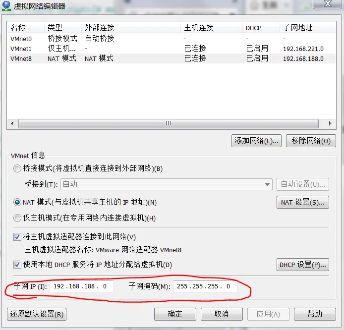 在ifcfg-eth0网卡配置文件中加入GATEWAY,IPADDR,DNS1,NETMASK,依照VMware中的虚拟网络编辑器配置。