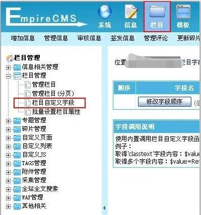 | 1、登录后台,单击“栏目”菜单,选择“栏目自定义字段”子菜单,进入管理栏目字段界面: |