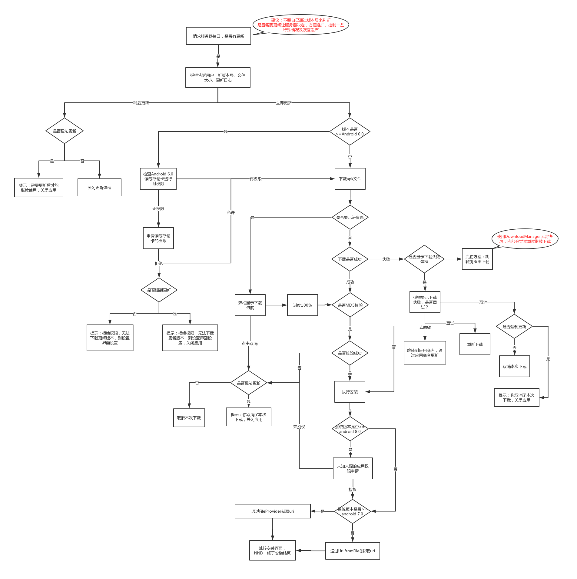 画图不易,这张流程图几乎包含了app检查更新的所有涉及到的流程,像流程图中进度框、下载失败的弹框,MD5校验个人觉得可以不需要,一般像DownloadManager来实现下载更新只需要在后台下载,下载完成用系统的Notification进行通知即可,然后自动弹出安装界面,这是个标准的流程。