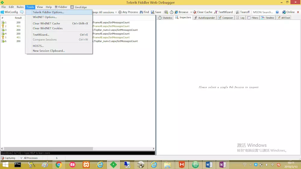 (1)启动Fiddler,打开菜单栏中的Tools > Options,打开“Options”对话框。