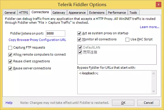 (2)在Options”对话框切换到“Connections”选项卡,然后勾选“Allow romote computers to connect”后面的复选框,切记:Fiddler 默认监听的端口:8888,然后点击“OK”按钮,关键:配置好之后,需要重启Fiddler。