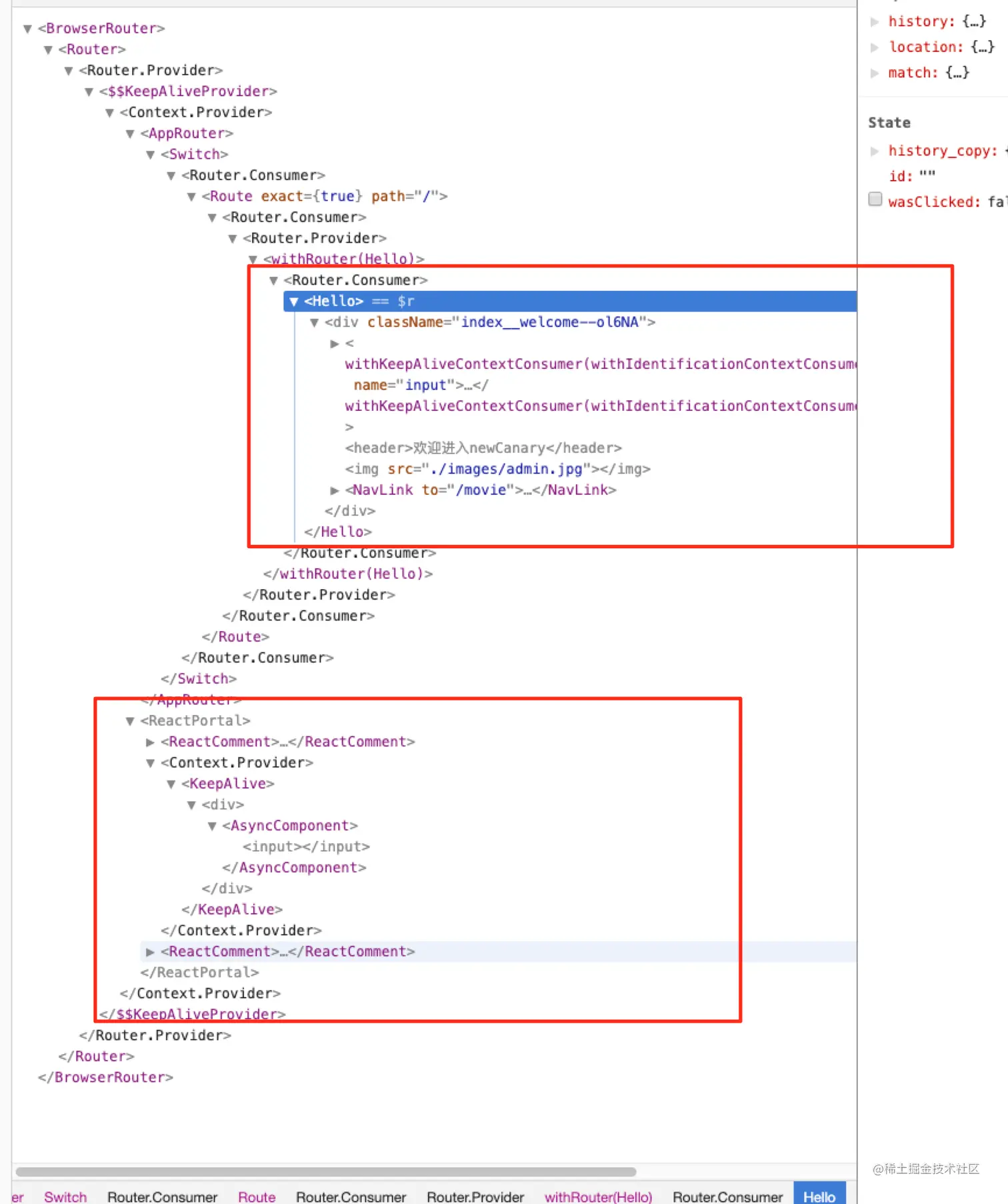 看页面react结构图,可以看到在页面最根部元素有创建一个ReactPortal,这个元素不会展示,但是可以缓存组件。结合react-router的path match,来决定是否在页面中展示缓存组件。