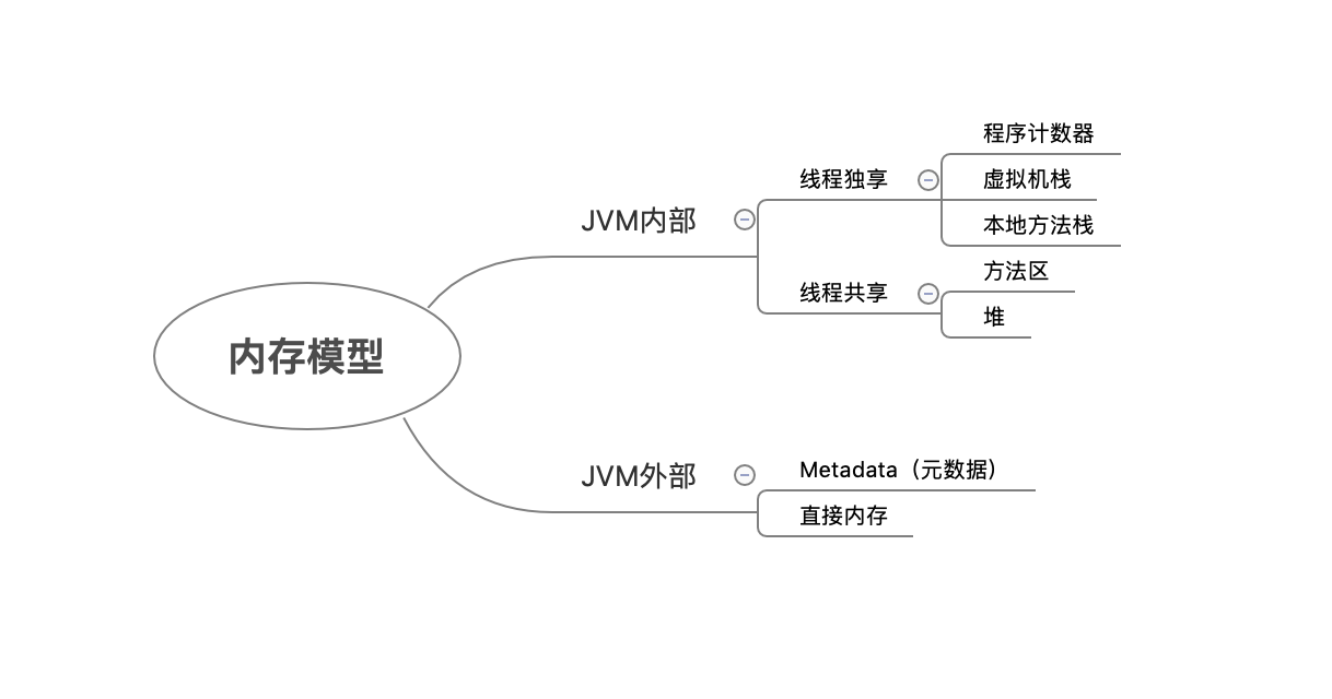 从所在区域角度上来说,可以分为内部内存和外部内存,其中内部的内存又包括了线程独占区和线程共享区。