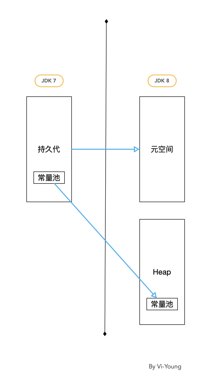 他们之间的区别是,JDK 7在持久代中的常量池在JDK 8移到了堆内存中,剩余部分移到了元数据中。