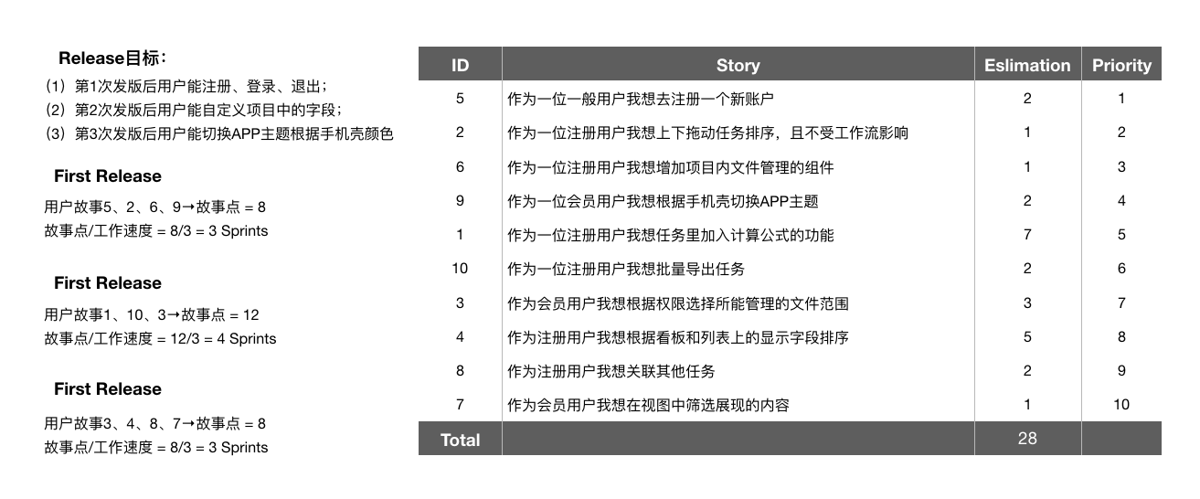 前面工作完成后,我们对于整体产品和开发时间会有一个大概的估计,那么就可以设计Release计划了。我们可以按照我们的估算,设计一个Release需要发布哪些特性,然后包括几个Sprints,下图为Release计划示例。