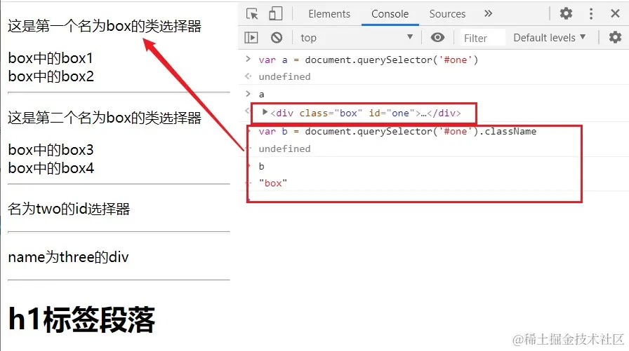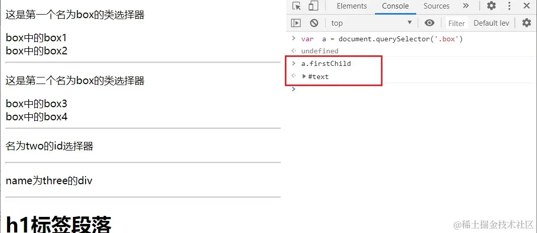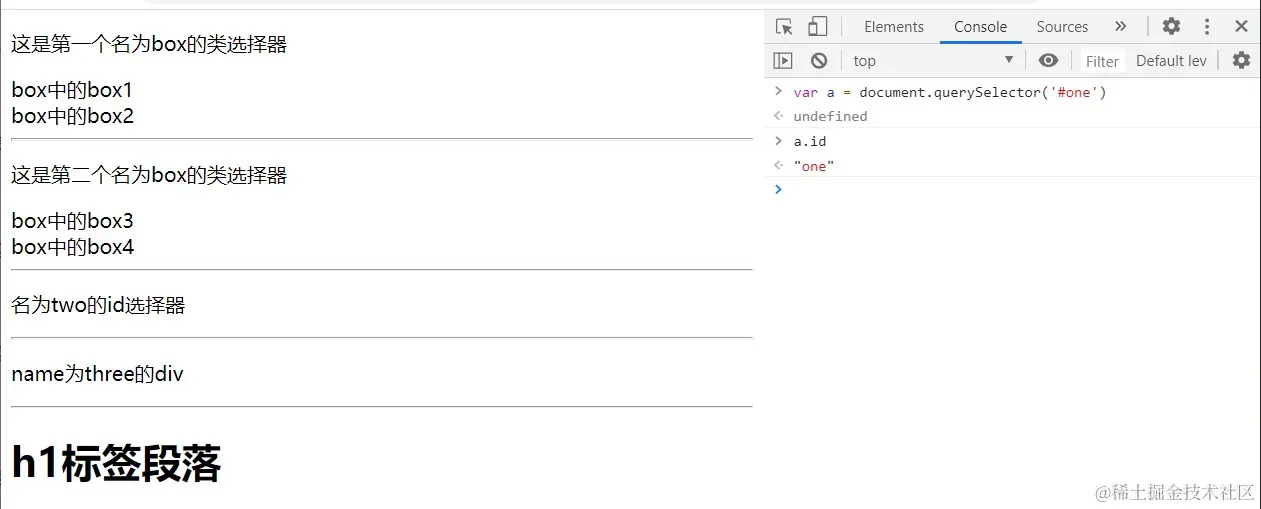 返回CSS选择器的元素结点。若多个节点满足条件,则返回第一个节点。若没有匹配的节点则返回null。
