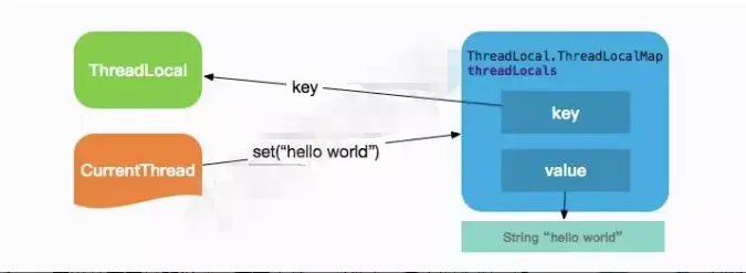 ThreadLocal其实是作为一个Map中的key而存在的,这个Map就是ThreadLocalMap,它以私有变量的形式,存在于Thread类中。拿上图为例,如果我创建了一个ThreadLocal,然后调用set方法,它会首先找到当前的thread,然后找到threadLocals,最后把自己作为key,存放在这个map里。