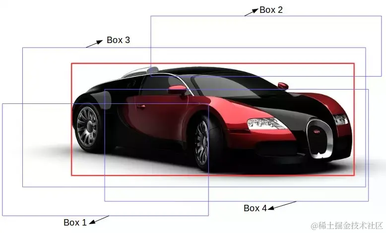 如图所示,框1与框2的交并比应该小于0.5,而框3与框4的交并比约大于0.5。因此可判定框3与框4属于该图的感兴趣区域,而框1及框2可弃之不用。