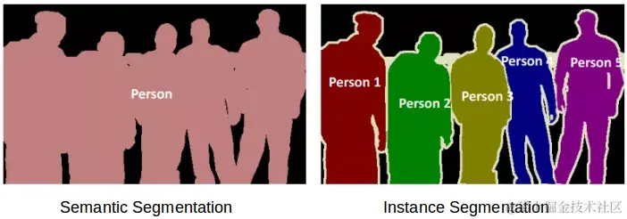 左图五个对象均为人,因此语义分割会将这五个对象视为一个整体。而右图同样也有五个对象(亦均为人),但同一类别的不同对象在此被视为不同的实例,这就是实例分割。