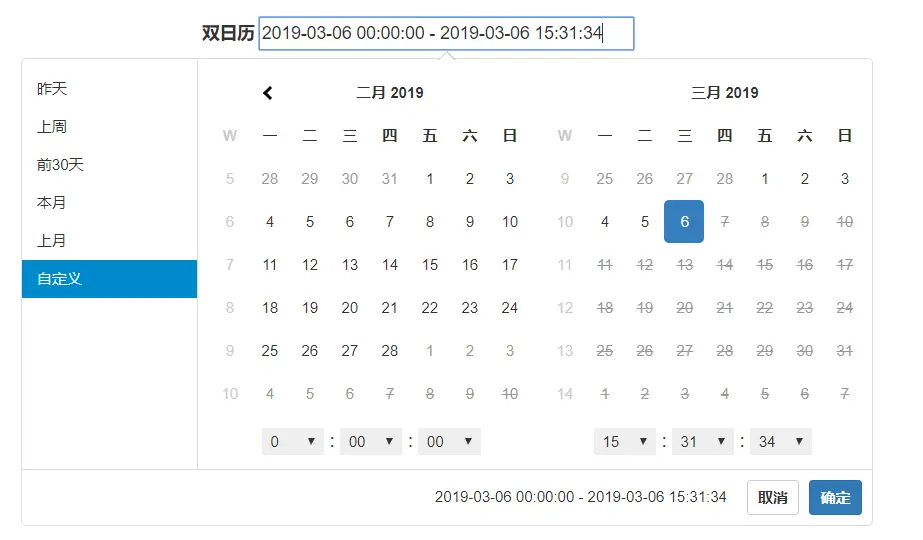 1.日期时间范围选择(双日历,可选择范围)