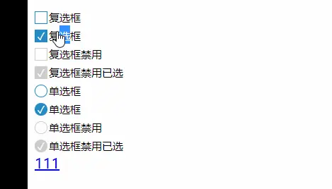 01 02 03 04 05 06 07 08 09 10 11 12 13 14 15 | <label><input type="checkbox"><i>✓</i>复选框</label><br><label><input type="checkbox" checked><i>✓</i>复选框</label><br><label><input type="checkbox" disabled><i>✓</i>复选框禁用</label><br><label><input type="checkbox" disabled checked><i>✓</i>复选框禁用已选</label><br><label><input type="radio" name="abc"><i>✓</i>单选框</label><br><label><input type="radio" name="abc" checked><i>✓</i>单选框</label><br><label><input type="radio" name="abc" disabled><i>✓</i>单选框禁用</label><br><label><input type="radio" name="def" disabled checked><i>✓</i>单选框禁用已选</label><br> |