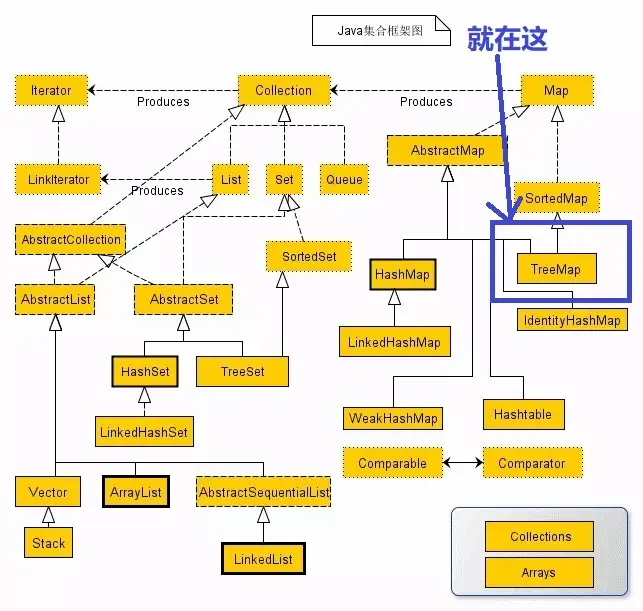 其实从名字就可以看出主要是和树有关,而且这棵树还是赫赫有名的红黑树。因为其处于java集合体系一个一个知识点,我们还是先看一下这个TreeMap处于整个集合体系的一个什么位置?
