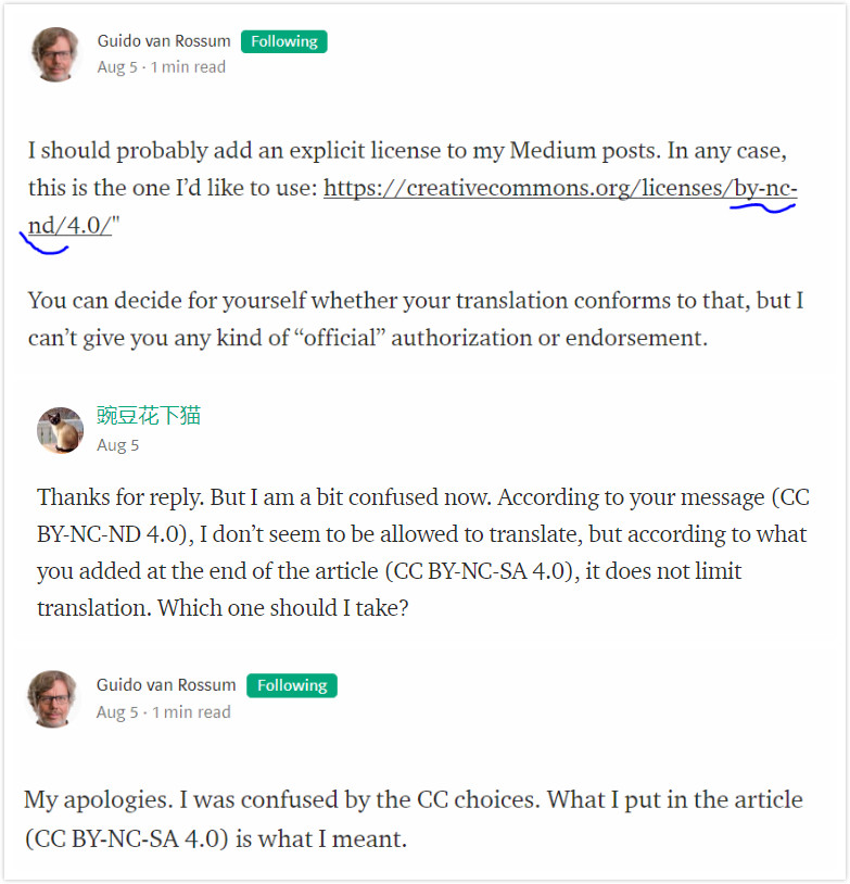 很多个人网站或文章,基本采用了"CC BY-NC-ND"或者"CC BY-NC-SA"之一。Guido 最初给我回复的是 ND 这种,后来才澄清为 SA。