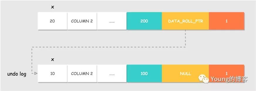表示指向该行回滚段(rollback segment)的指针,大小为 7 个字节,InnoDB 便是通过这个指针找到之前版本的数据。该行记录上所有旧版本,在 undo 中都通过链表的形式组织。