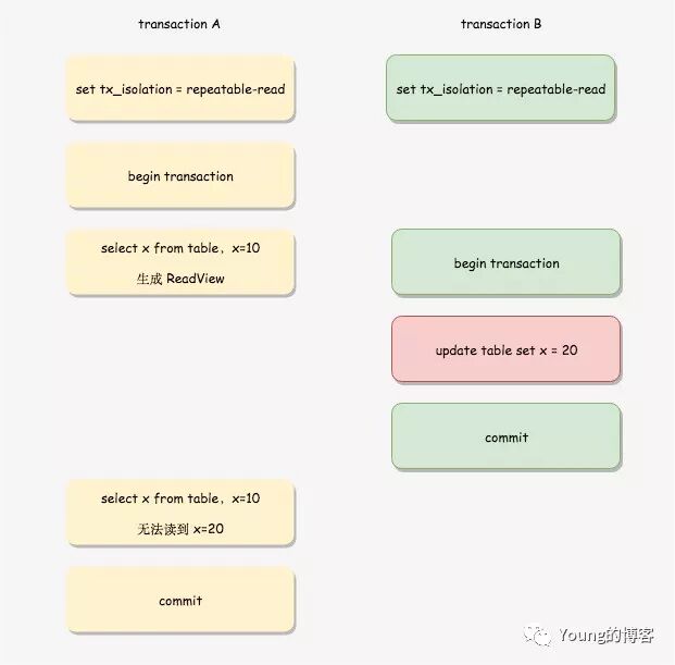 下图中,事务 A 的第一条 SELECT 语句在事务 B 的修改提交之后,因此可以读到事务 B的修改。但是注意,如果事务 A 的第一条 SELECT 语句查询时,事务 B 还未提交,那么事务 A 也查不到事务 B 的修改。