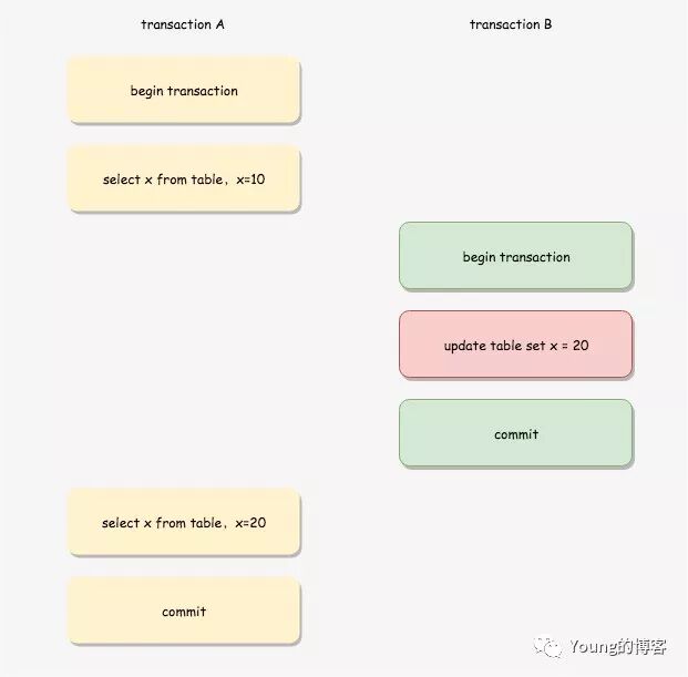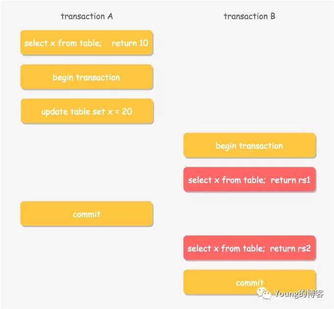 B的隔离级别是读已提交(RC),那么第一次读取到旧值10,第二次因为事务A已经提交,则读取到新值 20。 -