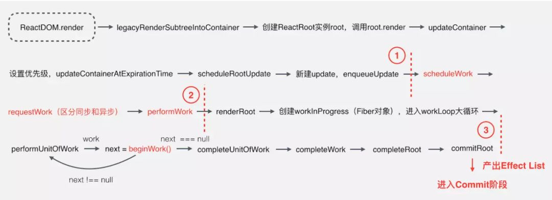 scheduleWork、requestWork、performWork,即安排工作、申请工作、正式工作三部曲,React 16 新增的异步调用的功能则在这部分实现,这部分就是 Schedule 阶段,前面介绍的 Cooperative Scheduling 就是在这个阶段,只有在这个解决获取到可执行的时间片,第三部分才会继续执行。具体是如何调度的,后面文章再介绍,这是 React 调度的关键过程。 -