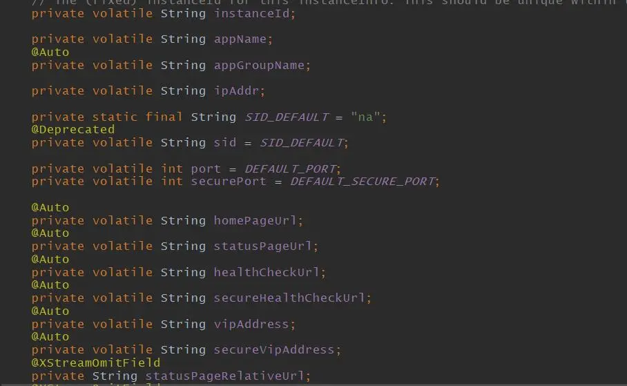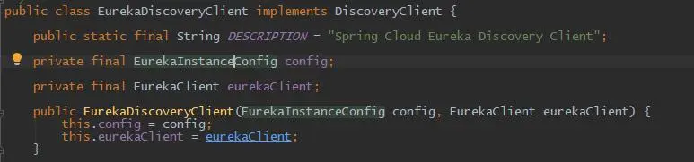 我们发现这个类中 引入了 EurekaInstanceConfig 和EurekaClient 对象,EurekaInstanceConfig是 服务注册的时的元素就配置信息,包括像服务的实例id、服务名称、心跳间隔时间、IP 地址等待,一般都是在启动时从application.properties中加载来的,