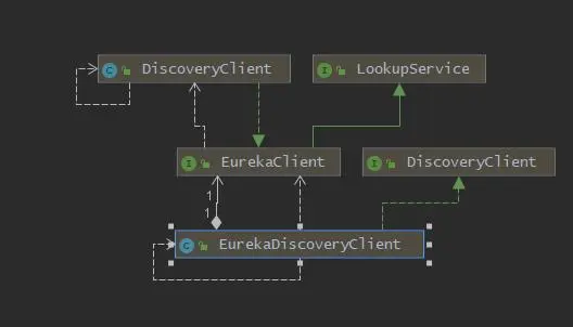 首先右边接口DiscoveryClient的实现类EurekaDiscoveryClient 中依赖EurekaClient接口,EurekaClient接口集成了LookupService,并且左边的DiscoveryClient的类实现 EurekaClient接口
