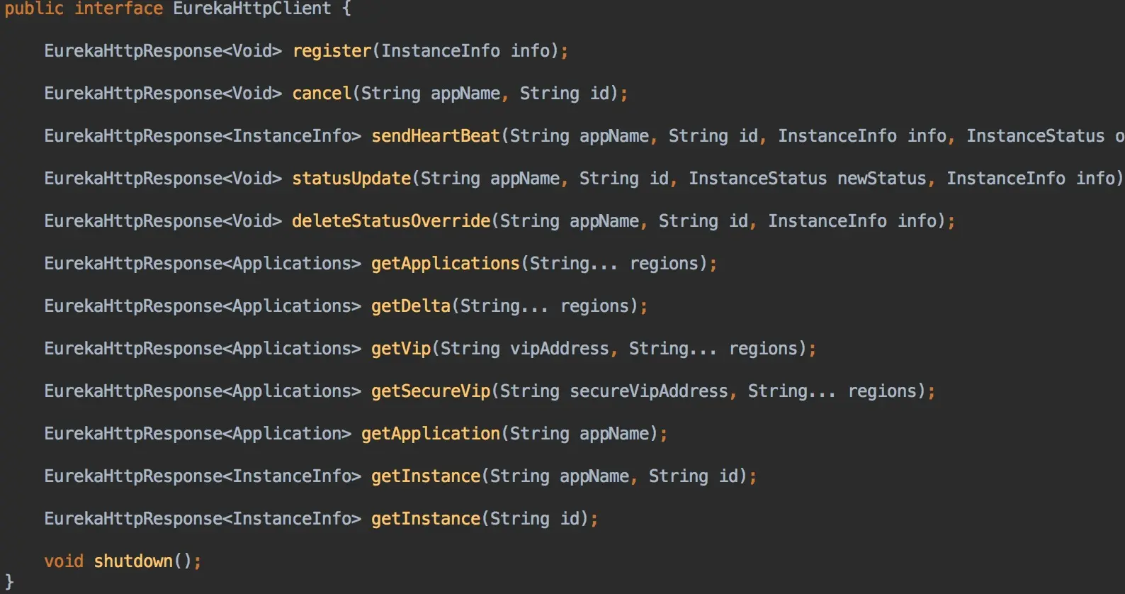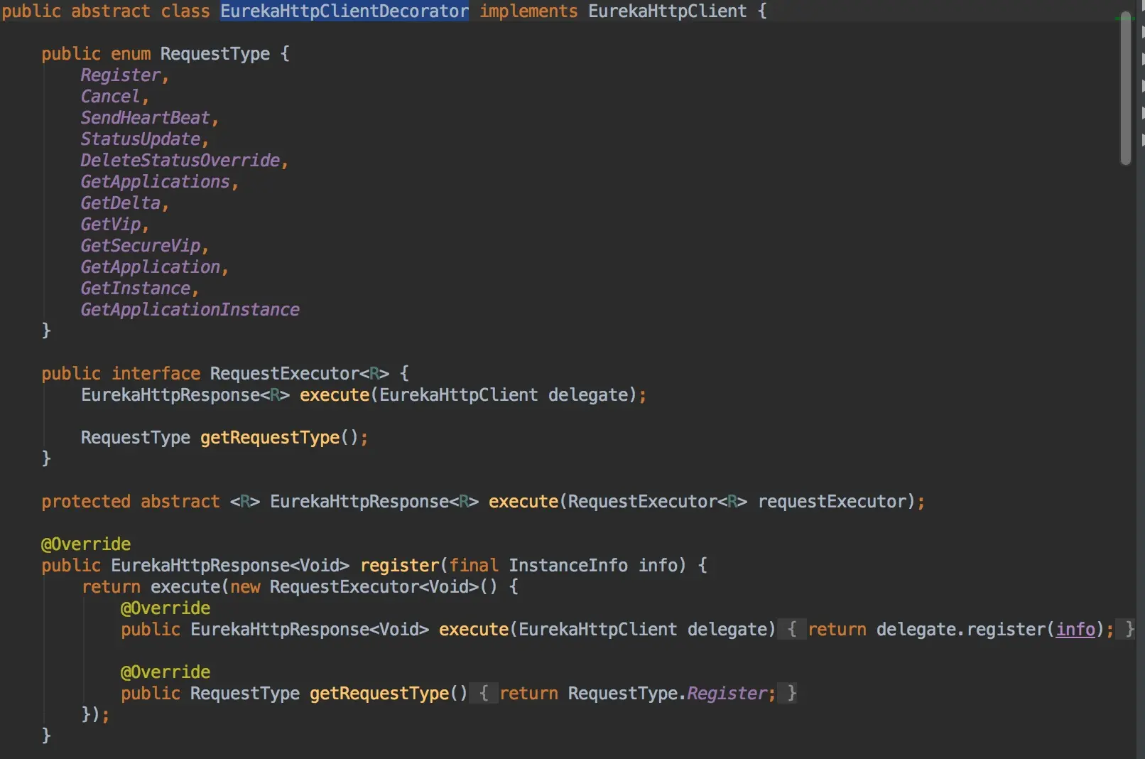 EurekaHttpClient是一个接口,他有个实现抽象类EurekaHttpClientDecorator