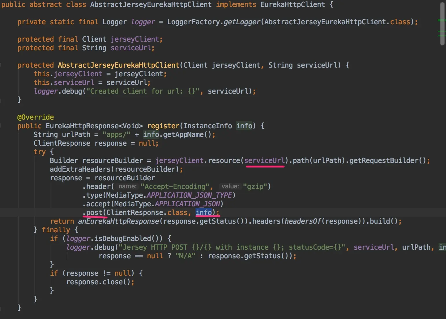 最后调用了AbstractJerseyEurekaHttpClient的register方法
