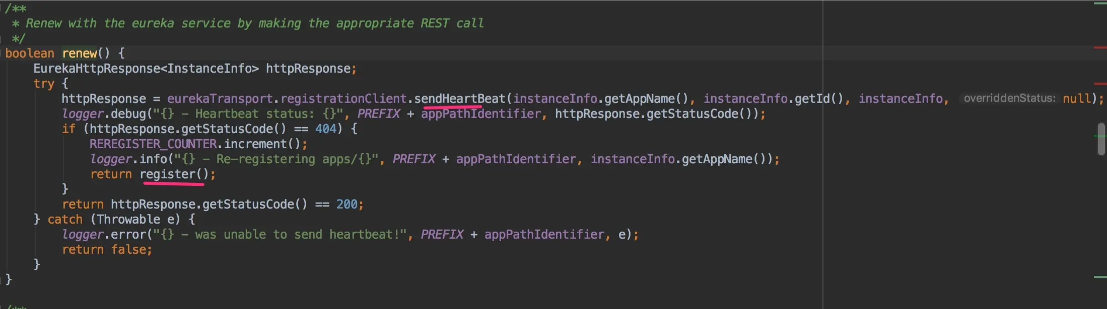 这时客户端已经续约完成了,如果发送心跳失败 返回404 程序,renew()中还会进行一次服务注册,保证服务的可靠