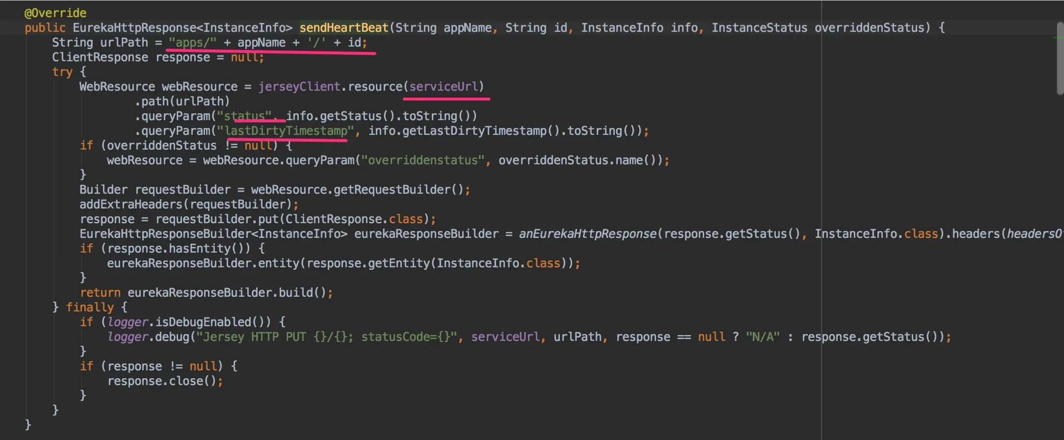 他依然通过装配者EurekaHttpClientDecorator,利用EurekaHttpClient的实现者AbstractJerseyEurekaHttpClient 来发送心跳请求