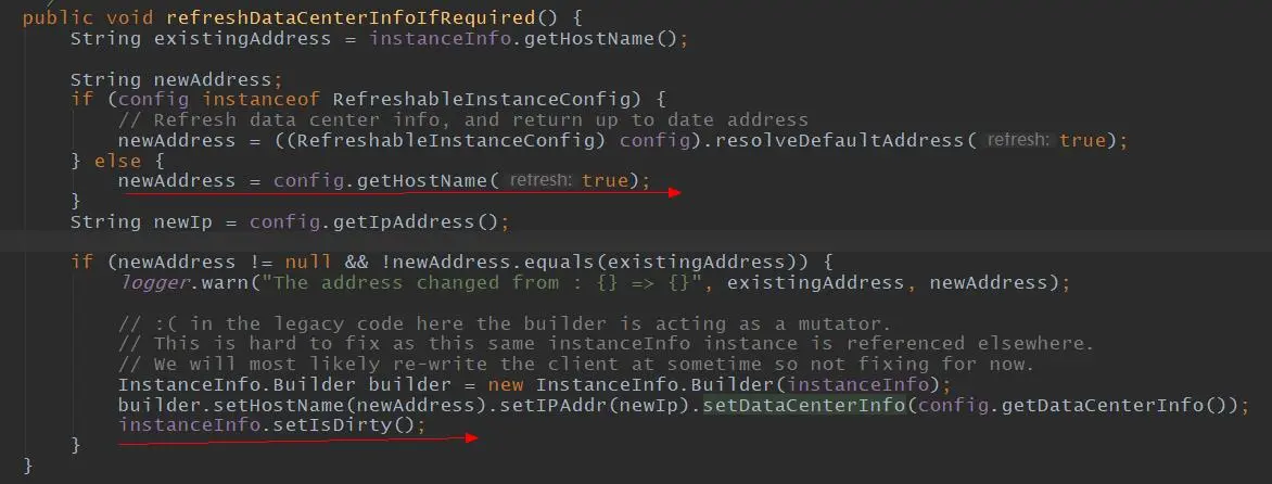 一般都走 else 分支语句,获取我们本地的IP地址,最后如果地址发生变化,一定要 instanceInfo.setIsDirty(),表示该服务发生变化,需要重新注册。