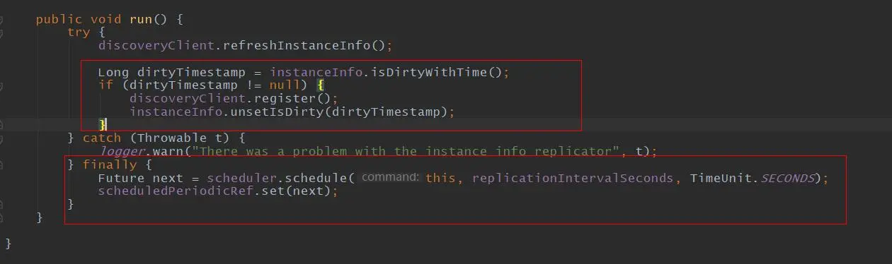 最后finally 里设置 replicationIntervalSeconds(40秒)再次执行这个线程任务,从而形成一个不断执行的定时任务去去注册服务。