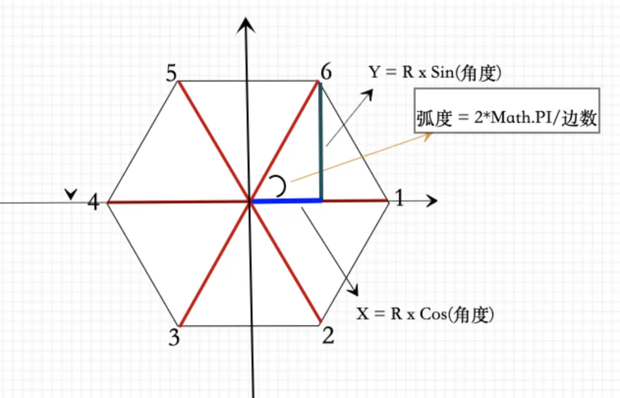 圆周角整个位2*Math.PI弧度(这里为什么要用弧度,因为下面的sin,cos计算只能接受弧度制),所以每个角度弧度为 2*Math.PI/边数 。