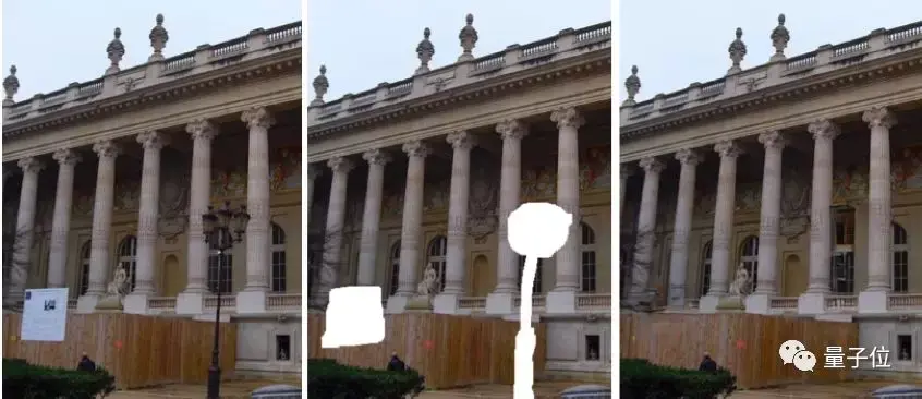 比如,抹掉一盏路灯,AI便会把路灯背后的建筑物补好。