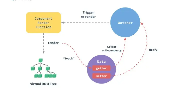 Vue在实例化的时候,会对Data下面的数据做一些getter、setter的转化。所谓的转化,说直白一点就是对数据做一些中间代理层,不管是获取数据还是设置数据重复赋值,都需要经过代理层执行相应的操作。组件在render的时候,会对Data里面用到的数据,会放到watcher池中,当数据发生改变时,才会执行触发视图的更新。