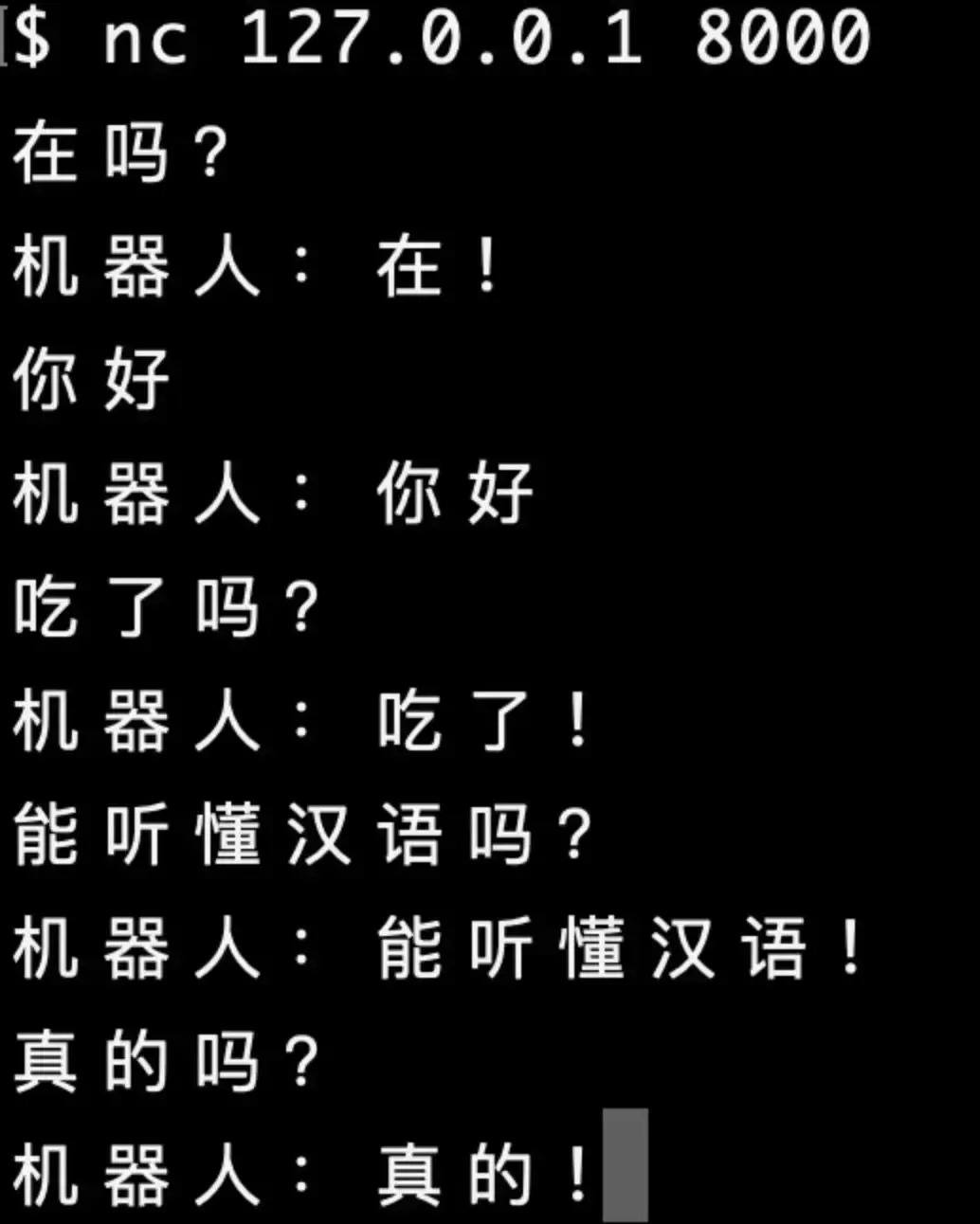 在上面tcp服务器的代码之上稍稍修改一下,一段价值过亿的AI机器人代码写好了。