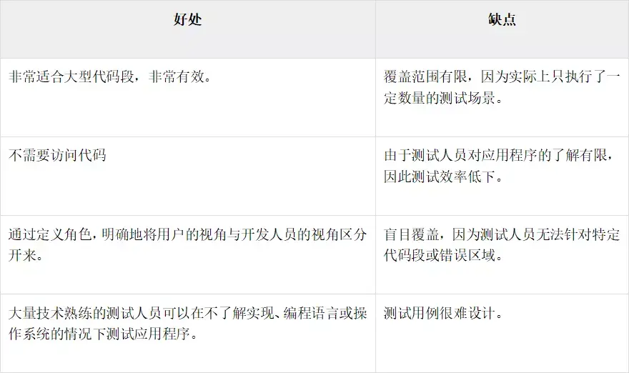 在不了解应用程序内部工作原理的情况下进行测试的方法称为黑盒测试。测试人员忘记了系统架构,无法访问源代码。通常,在执行黑盒测试时,测试人员将通过提供输入和检查输出与系统的用户界面进行交互,而无需知道输入的处理方式。