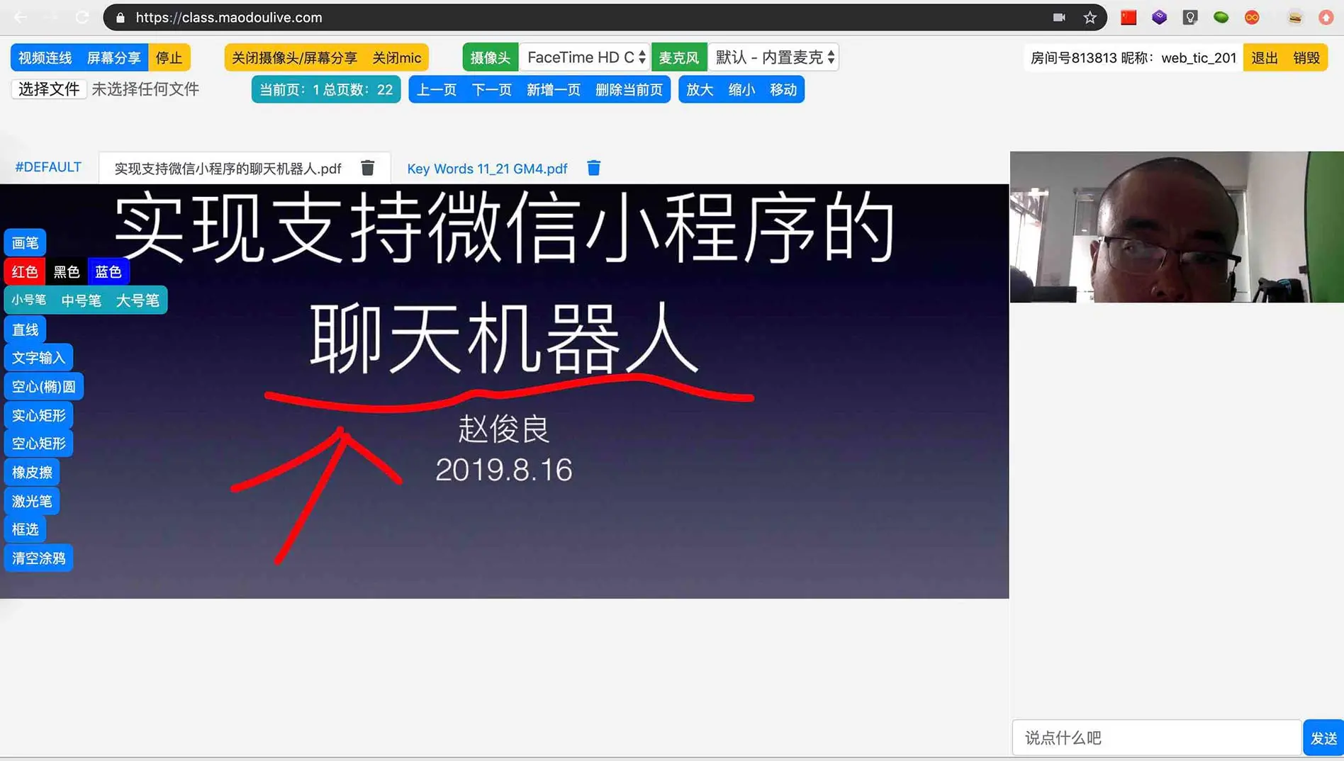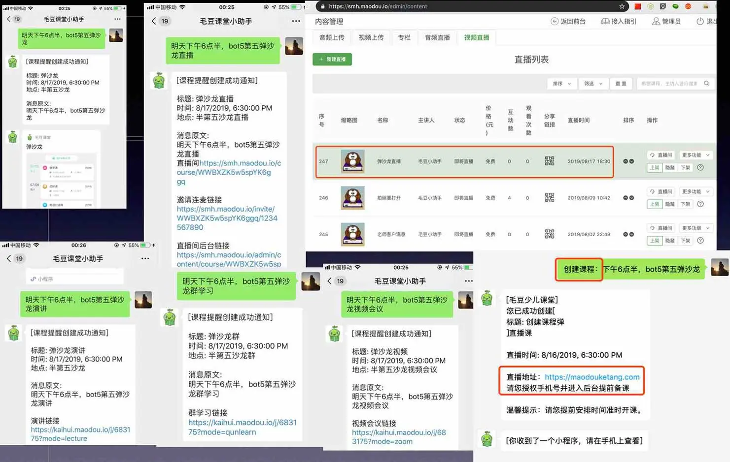 分享的最后,在现场做了一个毛豆课堂的demo,通过和小助手互动,创建了课程和小程序提醒,将小程序推送给现场嘉宾,加入小程序提醒后,会收到短信上课提醒,通过短信中的链接,用户能很快速进入课堂进行互动。